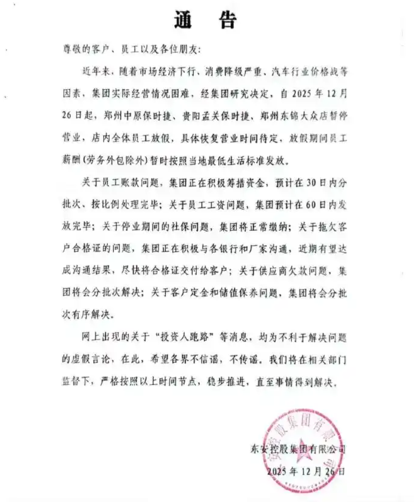 而涉事保时捷门店的母公司东安控股集团有限公司在发布的《通告》中称,经集团研究决定,自2025年12月26日起,郑州中原保时捷、贵阳孟关保时捷、郑州东锦大众店暂停营业,店内全体员工放假。