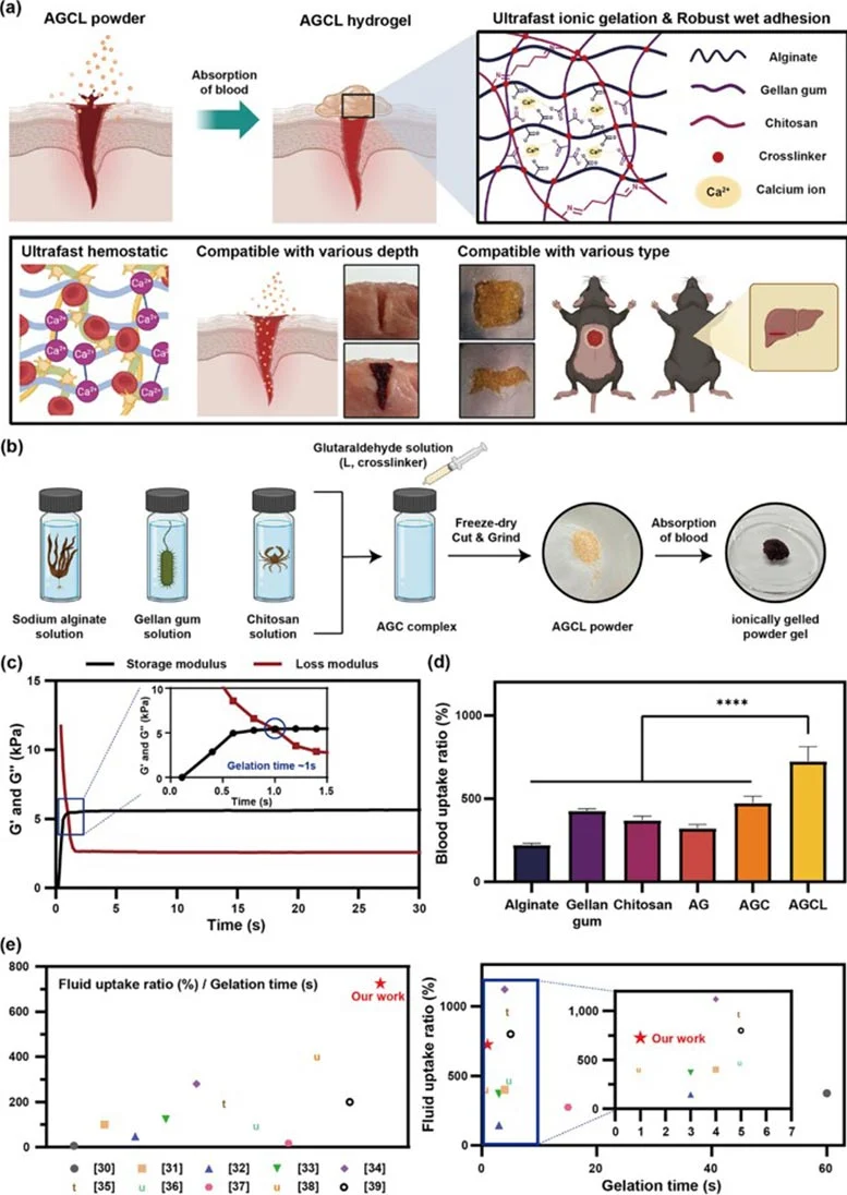 此次研发的“AGCL粉末”通过精心设计的离子凝胶机理,实现了超高速止血。 它由多种天然高分子材料构成:藻酸盐和洁兰胶可与血液中的钙离子快速反应,形成具备物理封堵功能的水凝胶网络;壳聚糖则与血液成分结合,增强化学及生物学止血效果。 粉末在接触含钙血液后,会在一秒内完成由粉末到三维凝胶结构的转变,将伤口“封死”,从源头阻断失血。