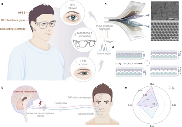 面肌痉挛导致的单侧面部不自主抽动,长期困扰患者生活。而传统治疗中,肉毒毒素注射效果短暂、显微血管减压术风险较高。如今,清华大学李翀副教授团队联合多学科力量,研发出一款眼镜式可穿戴闭环神经刺激系统,无需打针手术,就能实现面肌痉挛的监测与干预,相关成果已发表于《自然·通讯》。