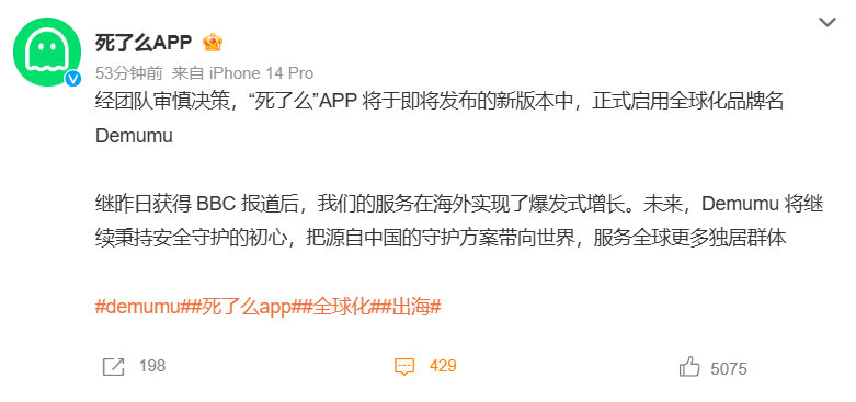 死了么APP官方今日晚间宣布,经团队审慎决策,“死了么”APP 将于即将发布的新版本中,正式启用全球化品牌名Demumu。其还强调,继昨日获得BBC报道后,我们的服务在海外实现了爆发式增长。未来,Demumu将继续秉持安全守护的初心,把源自中国的守护方案带向世界,服务全球更多独居群体。