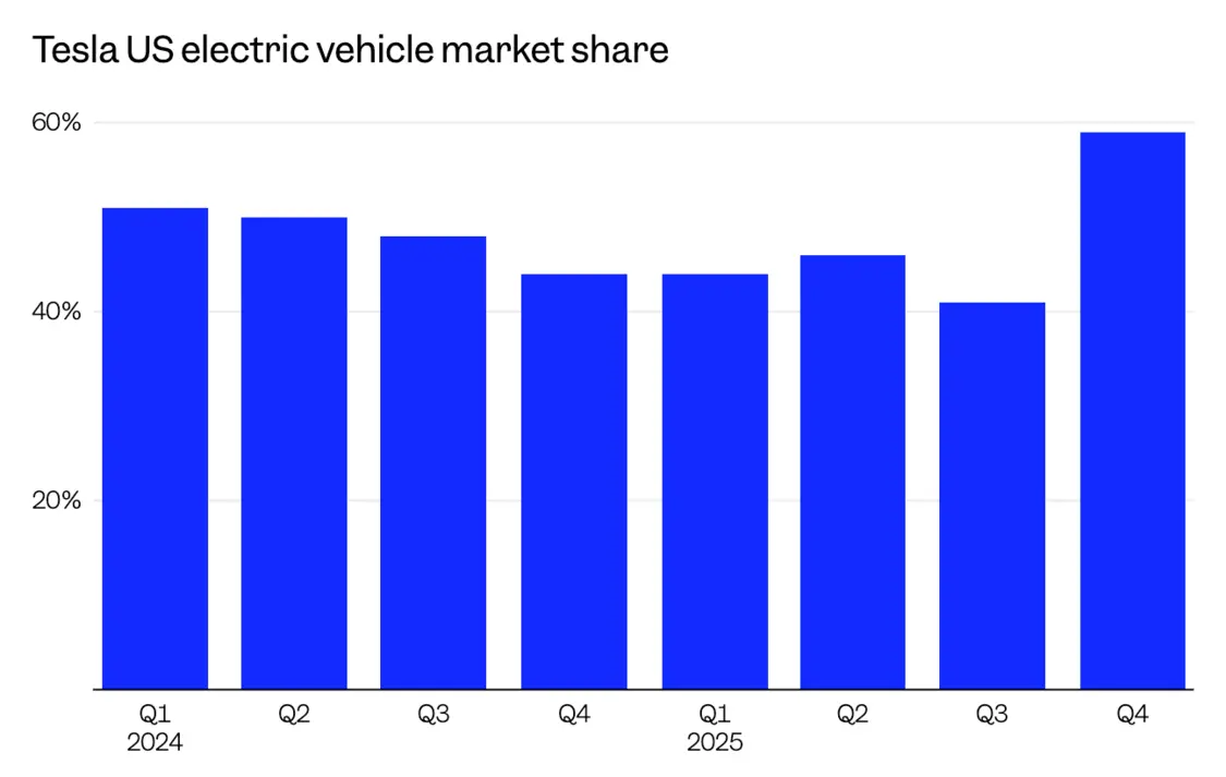 特斯拉第四季度美国电动汽车份额大增至59%