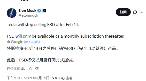 1月14日,特斯拉CEO马斯克在社交媒体平台X发帖表示,特斯拉将在2月14日后停止销售FSD。此后,FSD将仅以月度订阅的形式提供。