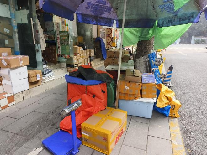 某家快递驿站堆放在门店外的快递
