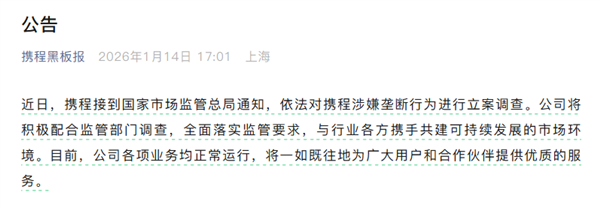 随后,携程官方发布公告称,近日已接到国家市场监管总局通知,依法对携程涉嫌垄断行为进行立案调查。公司将积极配合监管部门调查,全面落实监管要求,与行业各方携手共建可持续发展的市场环境。