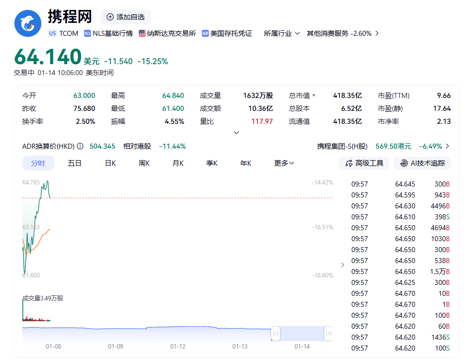 当日美股开盘,携程股价低开超-16%,一度大跌超-18%。截至发稿,跌幅-15.25%,市值蒸发75亿美元(约合人民币523亿元),最新总市值418.35亿美元。