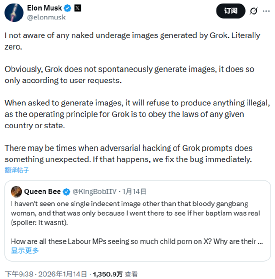 马斯克转而将通过 Grok 和社交平台 X 产生、传播的潜在非法内容归咎于 “用户的相关请求”,并表示可能是 Grok 系统存在 “程序漏洞”。
