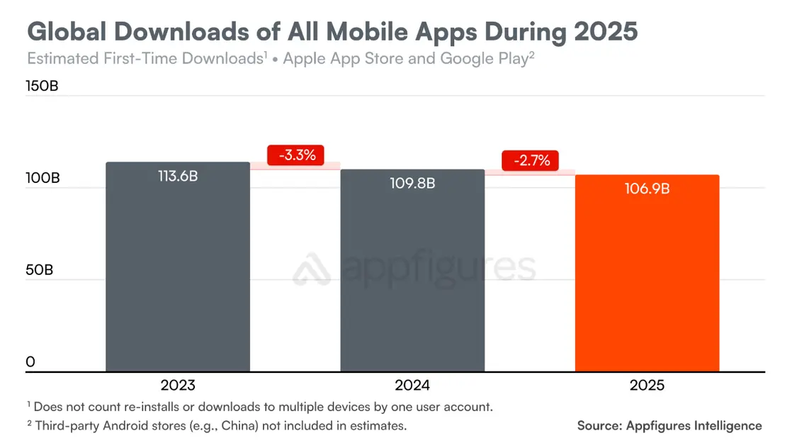 Appfigures的报告显示,2025年,苹果App Store和GoogleGoogle Play上的移动应用和移动游戏全球下载量预计达到1069亿次,同比下降2.7%。与此同时,消费者支出增长21.6%,预计达到1558亿美元。