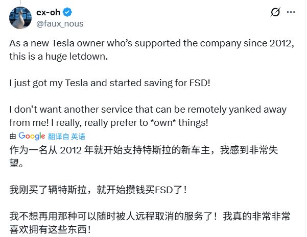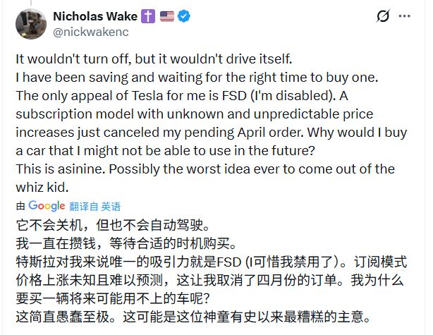 另一位车主说话更直,认为订阅制带来的价格变动风险,正在稀释特斯拉的核心价值,这简直是“极其糟糕的决策”。