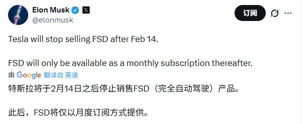 美国当地时间1月14日凌晨,马斯克用一条推文,亲手终结了FSD长达十年的“买断制”:“2月14日后,特斯拉停售FSD。此后,仅提供月度订阅。”这意味着,从2月14日情人节起,曾被标榜为“增值理财产品”的8000美元永久版FSD将正式绝版。以后想要?只剩唯一的路径:付费订阅,每月99美元。