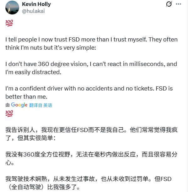 而在用户这边,口碑也裂开了。 有死忠粉觉得,相比自己开车,他更信赖FSD的反应速度,觉得交给AI更安全。