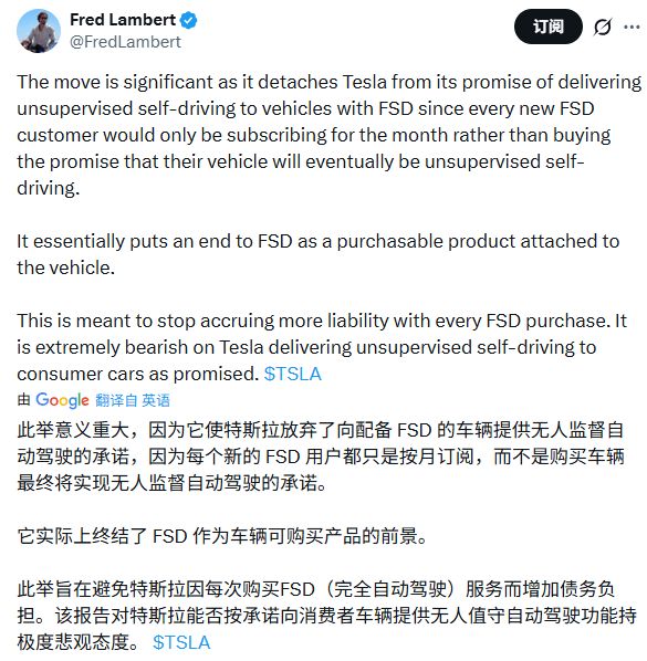 说白了,FSD从这一刻起,不再是属于你的资产,而是每月的耗材。