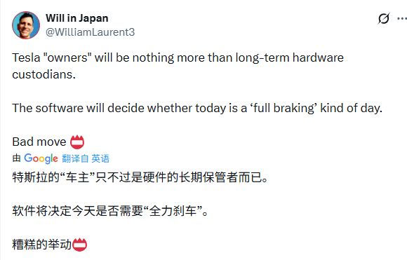最耐人寻味的是,面对这么大的改动,马斯克和官方没给任何深层解释。这留给外界一个巨大的解读空间:乐观的人觉得这是门槛低了;悲观的人则看透了本质:“车辆所有权”正在瓦解,你不再拥有功能,你只是在租用权限。