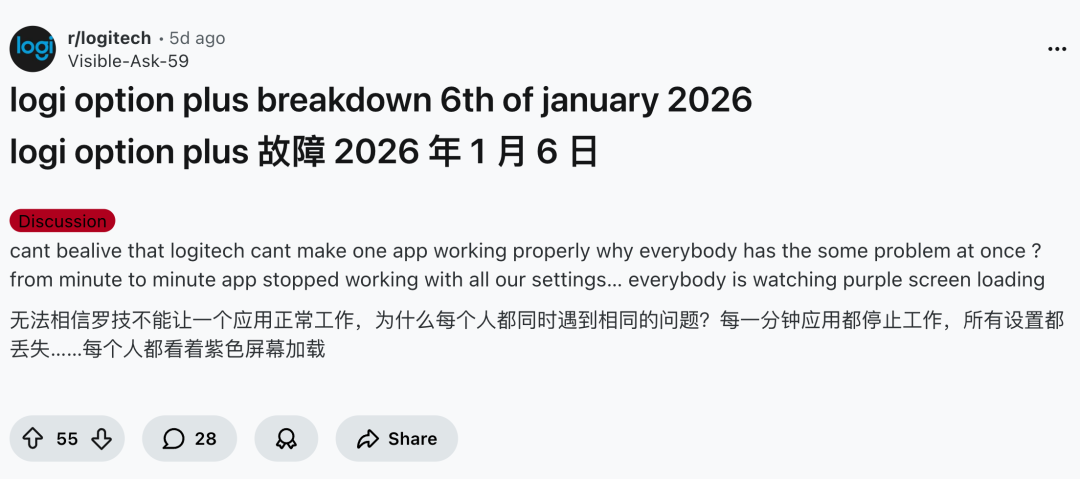 上周三,差评编辑部群照常在群里摸鱼。这时有人突然冒出一句:你们罗技鼠标还好吗,我的驱动咋打不开了……很快啊,群里好几个人出现了一样情况。有人滚轮不听话了,侧键失灵了,还有人的手势没反应了。他们还说想修都修不了,因为罗技的配置工具 Options+一直打不开,无限卡基佬紫页面。