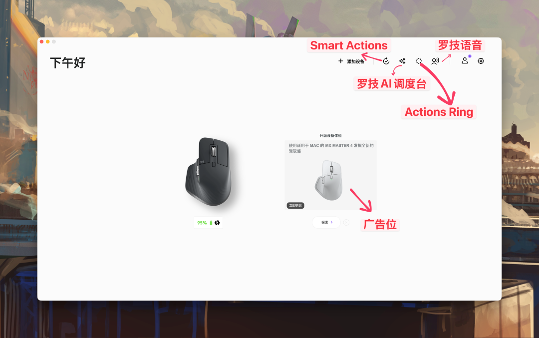 广告位、罗技语音、罗技 AI 调度台、Actions Ring、Smart Actions 塞得满满当当。