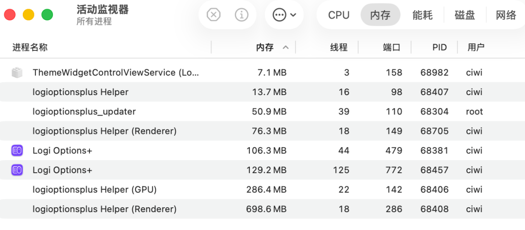 我为了录制素材刚下载 5 分钟的罗技 Options+,内存已经干到了 1G。