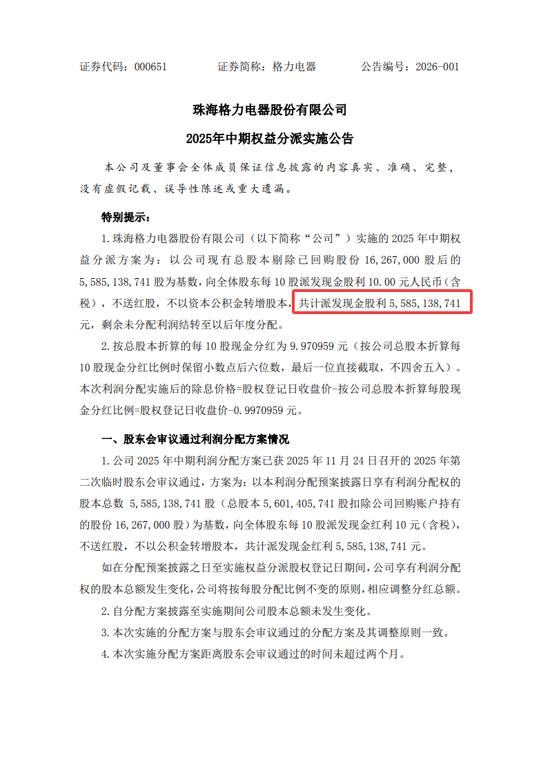 今晚,格力电器发布公告,确定了公司2025年中期权益分派方案。具体方案为:以现有总股本剔除已回购股份后的55.85亿股为基数,向全体股东每10股派发现金股利10元(含税),不送红股,不以资本公积金转增股本,共计派发现金股利55.85亿元。