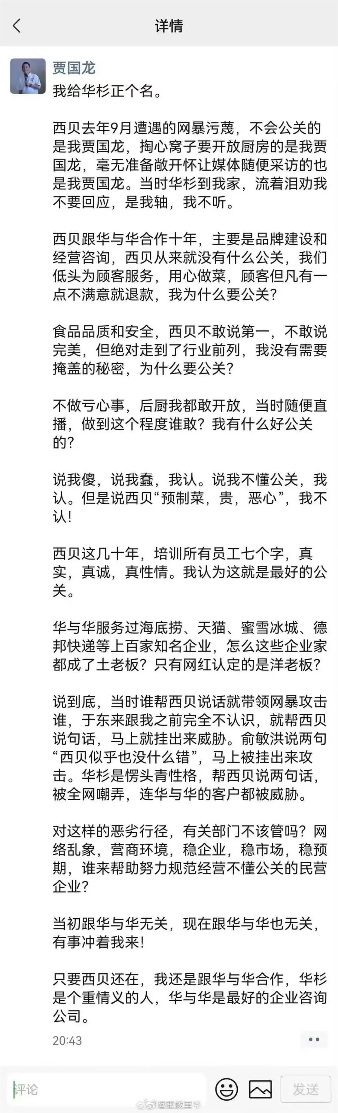 他同时提及,当时帮西贝发声的于东来、俞敏洪等均被网暴,华杉也因声援被嘲讽、客户受威胁。贾国龙呼吁有关部门整治网络乱象,并表态将继续与华与华合作,称其是“最好的企业咨询公司”。