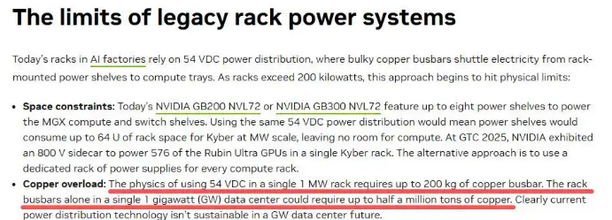 近日,英伟达一篇关于数据中心铜需求的技术论文因数据单位错误,引发市场对“铜短缺”的误判,随后英伟达悄然修正相关数据,数据中心领域铜需求预期被大幅调低。回到这篇原先论文,它在介绍英伟达的800VDC高压直流电架构时曾指出,传统架构中,单个1吉瓦机架的铜母线用量则高达50万吨。
