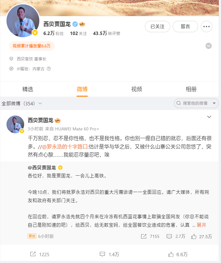 今天下午,西贝董事长贾国龙发布预告称,今晚10点将就罗永浩对西贝的重大污蔑诽谤一一全面回应。很多吃瓜网友都在期待10点能上演一场“大战”,结果实际并没有如期出现,反而贾国龙、罗永浩的微博账号被双双禁言。