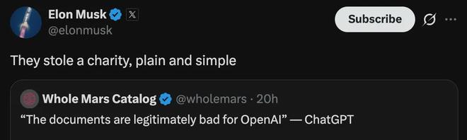 马斯克在 X 上直接评论:“他们偷了一个慈善组织,就这么简单。”