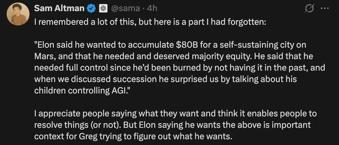 “我之前记得很多这些细节,但这个部分我完全忘了:『Elon 说,他需要攒到 800 亿美元来建一个能在火星上自给自足的城市,他认为自己需要、也配得上多数股权。他还说必须有完全的控制权,因为以前没控制权吃过大亏。在聊到公司继任、接班问题时,他突然提到要让他的孩子们来掌控 AGI,这让我们挺震惊的。』我觉得大家直接说清楚自己想要什么挺好的,这样才能真正解决问题或看清没法解决。但 Elon 当时提出这些要求,正是 Greg Brockman 纠结、思考公司未来方向的重要背景。”