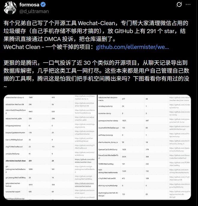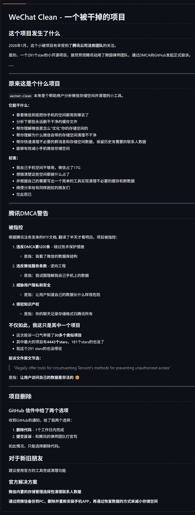 有消息称,腾讯已正式向 GitHub 发出 DMCA 投诉函,要求平台下架一批“允许用户导出或分析自己微信聊天记录”的开源项目。其中,较受关注的项目之一 WeChat Clean,其维护者已公开表示:在法律压力下,项目被迫停止维护。