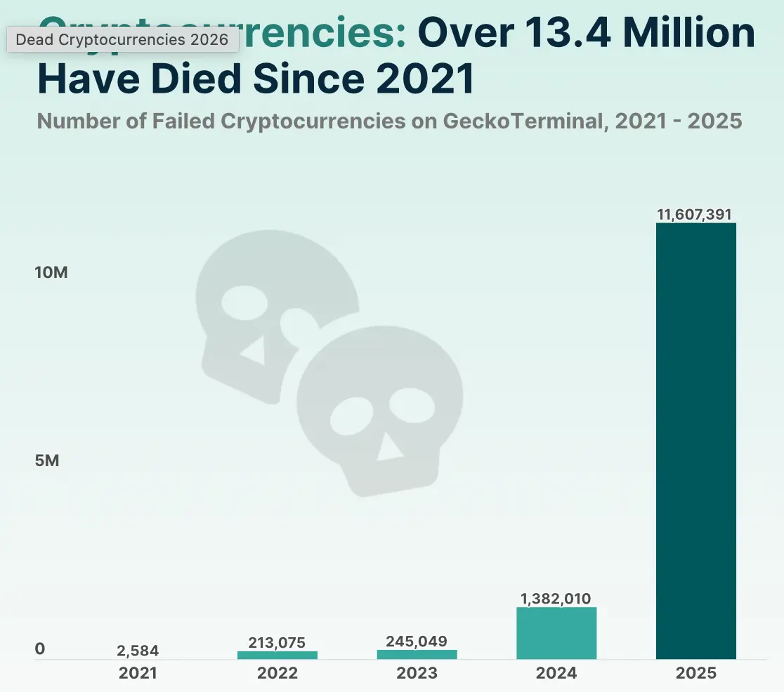 超过一半加密代币已“阵亡” 2025年成项目死亡高峰年