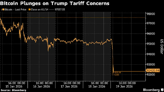 美国总统唐纳德・特朗普提议对八个欧洲国家加征新进口税后,风险资产价格普遍下挫,避险需求升温,加密货币随之大幅跳水。周一早间,比特币价格跌幅扩大至3.6%,跌破92000美元关口;其他加密代币跌幅更为显著,全球第二大数字资产以太坊价格下跌4.9%,索拉纳币跌幅达8.6%。据CoinGecko数据显示,此次抛售潮导致加密货币市场总市值蒸发约1000亿美元。