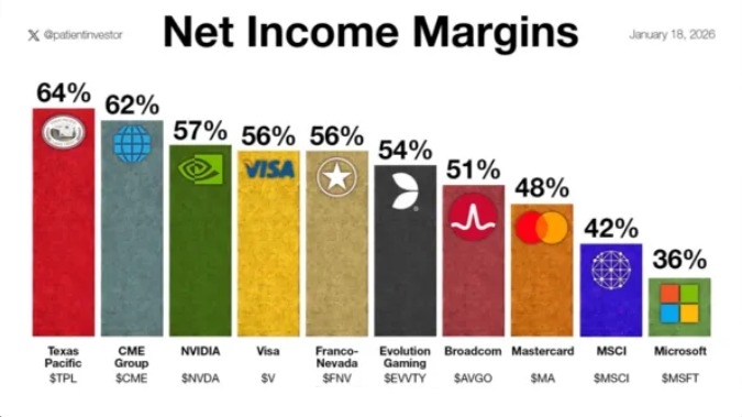 榜单显示,德州太平洋投资(Texas Pacific)以64%的净利润率高居榜首,其主要收益来源于土地、自然资源管理及相关特许权收益。美国芝加哥商品交易所集团(CME Group)以62%的净利润率位列第二,该集团作为全球金融衍生品交易枢纽,掌握着期货与期权市场的关键基础设施。