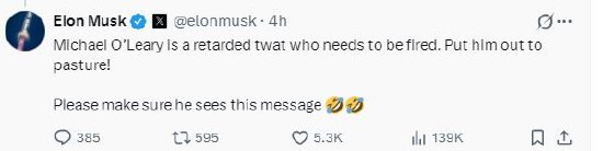 马斯克回应称,“瑞安航空CEO是个十足的白痴。解雇他!”