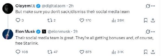 马斯克回应称:“他们的社交媒体团队很棒。他们所有人都将获得奖金,当然还有免费的星链。”