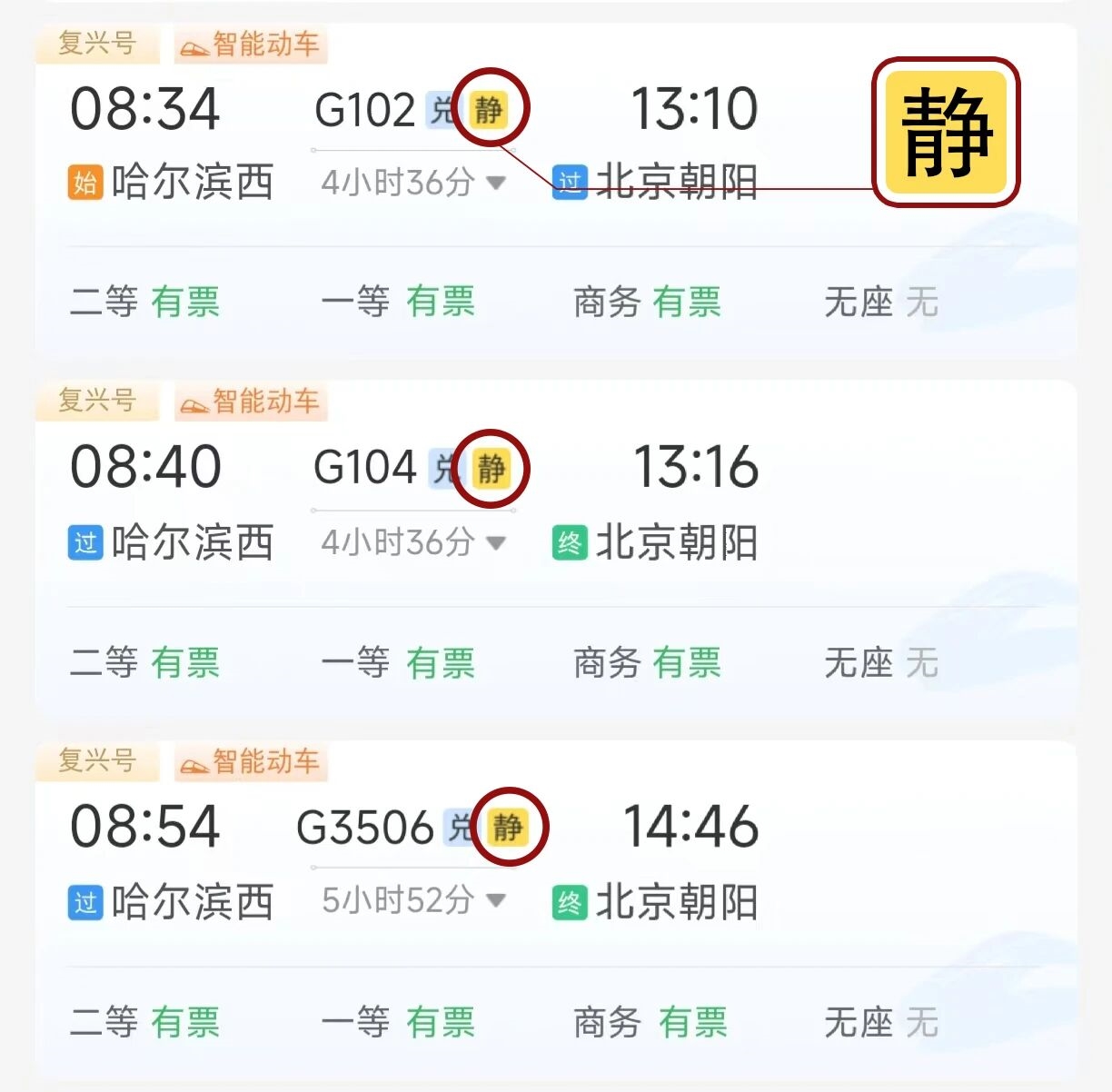 提供“静音车厢”服务的列车在铁路12306购票界面上会标注“静”字,旅客购票时须同意静音约定,方可购买“静音车厢”车票。