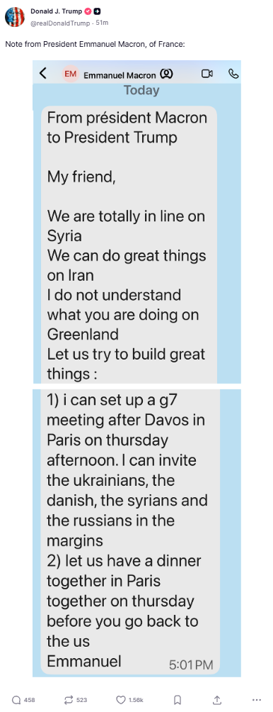 美国总统特朗普稍早前在社交平台发布了一张截图,内容显示的是法国总统马克龙通过Signal发送给他的短信。短信中,这位法国总统向特朗普表示,自己 “实在无法理解你在格陵兰岛问题上的所作所为”。