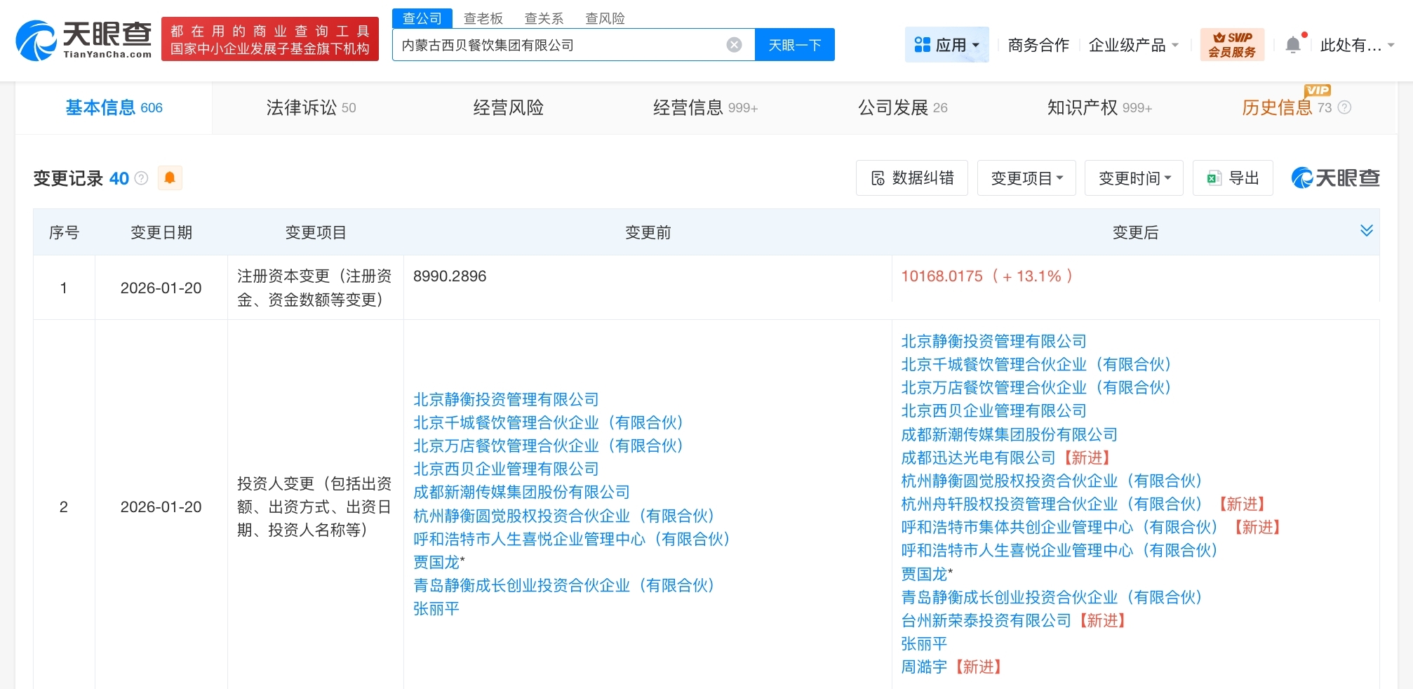 一次性关闭全国102家门店之后,西贝迎来最新进展。天眼查工商信息显示,近日,内蒙古西贝餐饮集团有限公司发生工商变更,新增台州新荣泰投资有限公司、呼和浩特市集体共创企业管理中心(有限合伙)、杭州舟轩股权投资管理合伙企业(有限合伙)等为股东,同时,注册资本由约8990.3万人民币增至约1.02亿人民币,增幅约13%。