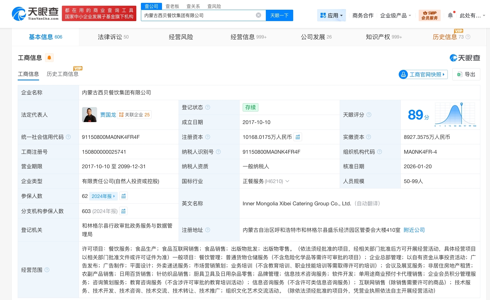 内蒙古西贝餐饮集团有限公司成立于2017年10月,法定代表人为贾国龙,经营范围含餐饮服务、食品生产、食品互联网销售、食品销售、餐饮管理、企业总部管理、以自有资金从事投资活动等。