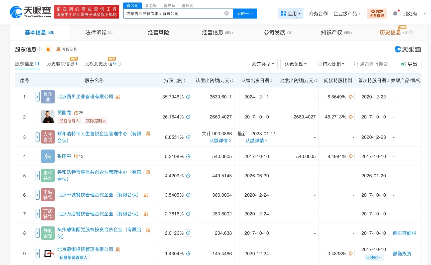 股东信息显示,该公司由北京西贝企业管理有限公司、贾国龙、呼和浩特市人生喜悦企业管理中心(有限合伙)等共同持股。