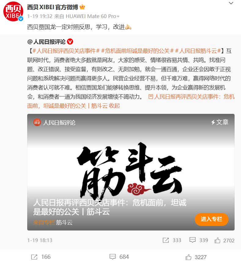 对此,西贝官方转发回应称:“西贝贾国龙一定对照反思,学习,改进。”