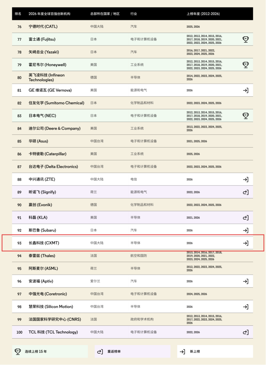 据全球权威科技信息分析机构科睿唯安(Clarivate)发布的2026年度“全球百强创新机构”榜单,中国存储芯片龙头企业长鑫科技首次登上该榜单。值得注意的是,长鑫科技也是本年度7家上榜的中国大陆企业中,唯一的一家半导体存储企业。