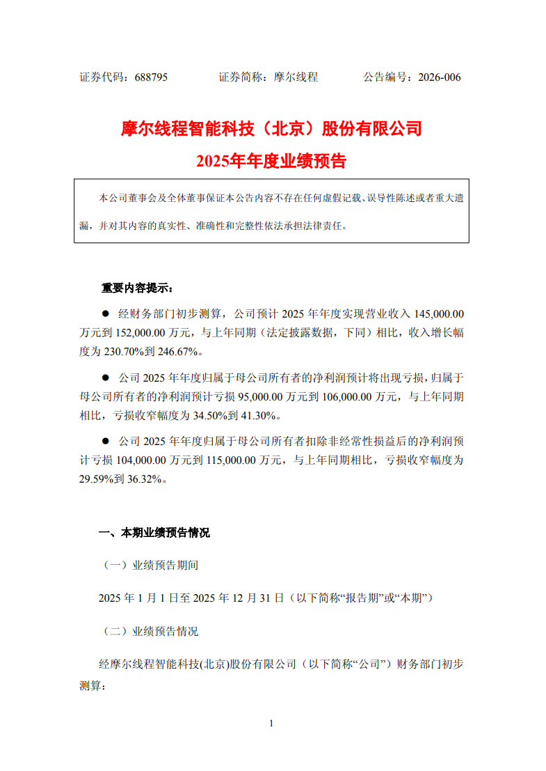 今晚,摩尔线程发布了上市后首份业绩预告:预计2025年实现营业收入14.5亿元到15.2亿元,同比增长230.70%到246.67%。归属于母公司所有者的净利润亏损9.5亿元到10.6亿元,上年同期亏损16.18亿元。