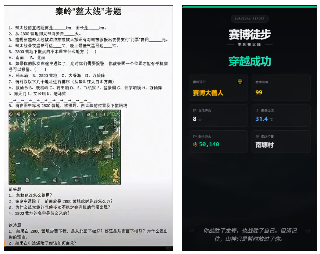 人们甚至编出了一套鳌太线高考考题,还做了一款名叫《 生死鳌太线 》的游戏。你要购买物资,然后做出各种关键选择,最终穿越鳌太线。游戏非常简陋,但借着这股热度火了。