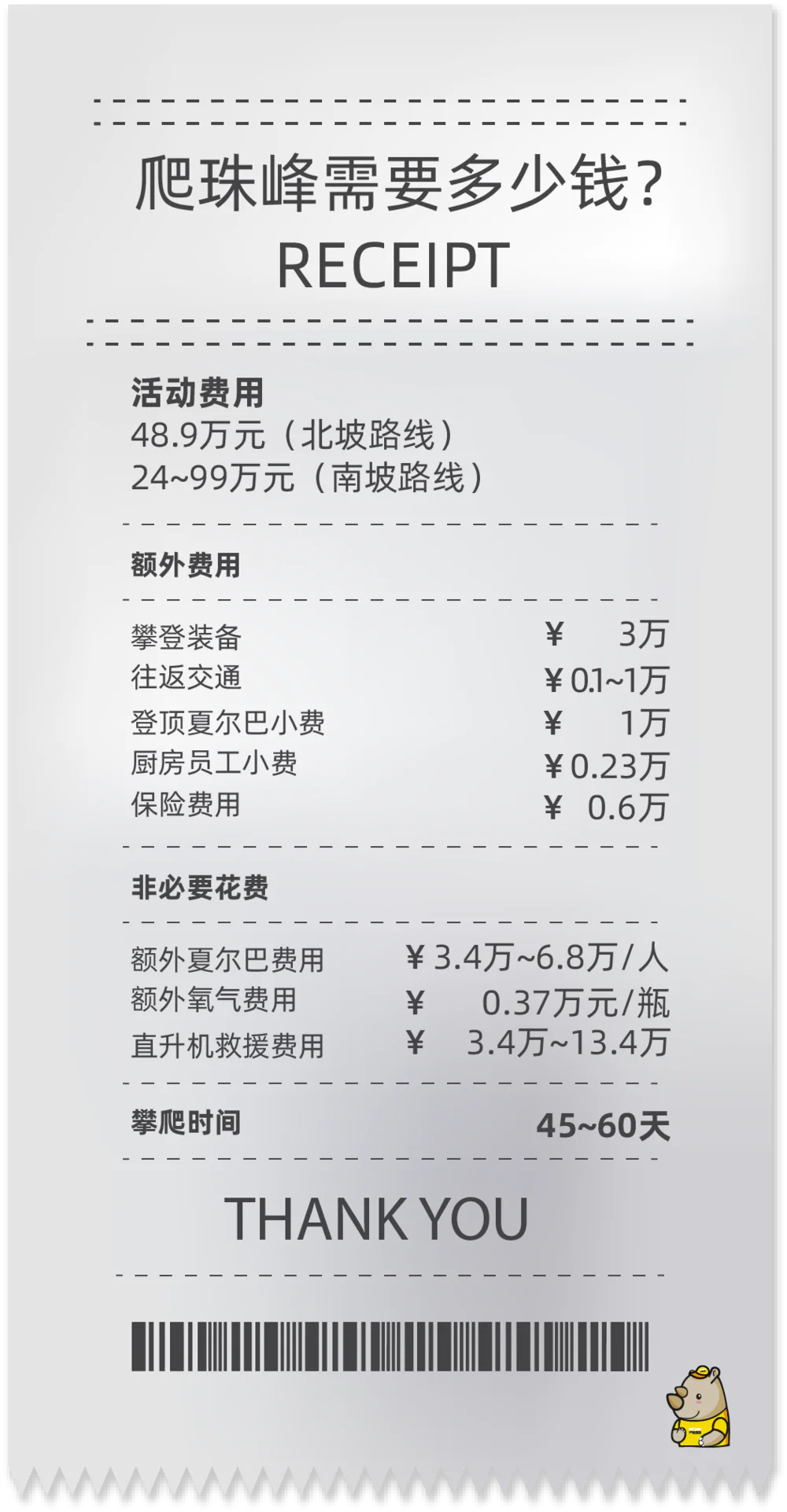 举个例子,爬珠峰光是入场许可证,就要 1.1 万美刀。其他准备工作加起来,没个几十万下不来。