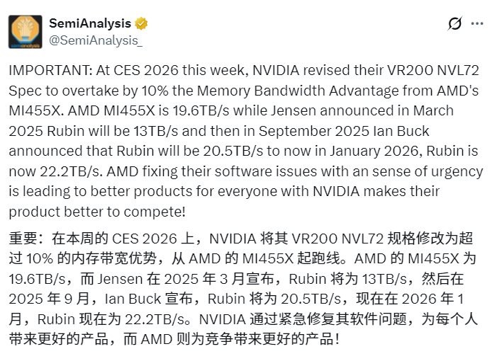 NVIDIA与AMD在AI芯片上的竞争愈发激烈,为了应对AMD的Instinct MI455X AI芯片的挑战,NVIDIA正在对其下一代Vera Rubin平台进行升级,特别是在内存带宽方面。SemiAnalysis透露,在CES 2026上,NVIDIA将其Vera Rubin NVL72内存带宽规格,修改为超越AMD MI455X芯片10%。