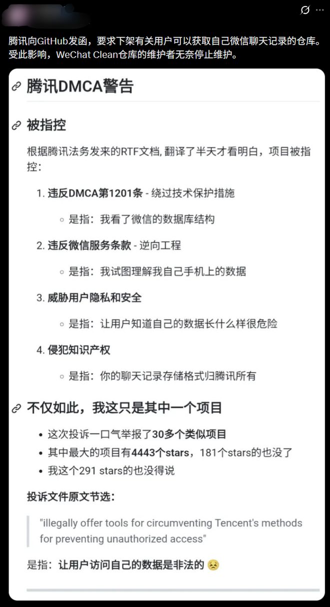 这意味着腾讯正在投诉要求下架第三方读取微信聊天记录的开源项目。