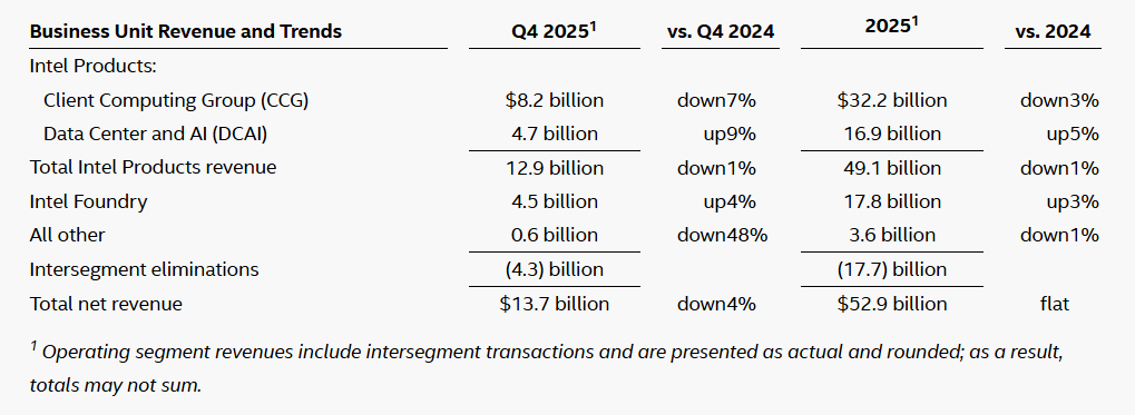 Intel今天公布了2025年第四季度和全年财报,依然存在亏损,但已经走到了扭亏为盈的边缘。按照国际通用会计准则(GAAP),Intel第四季度总收入137亿美元,同比下滑4%,毛利率36.1%,同比下滑3.1个百分点,净亏损6亿美元,同比扩大5倍,每股亏损0.12美元。
