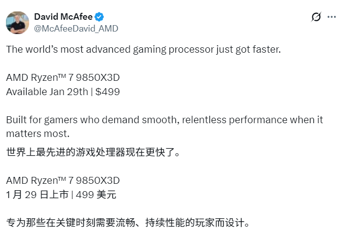 AMD官方宣布,其最新的Zen 5架构桌面游戏处理器锐龙7 9850X3D 将于1月29日正式上市,售价为499美元。这款处理器在CES 2026上发布,凭借更高的加速频率,取代了9800X3D成为全球最快的游戏处理器。