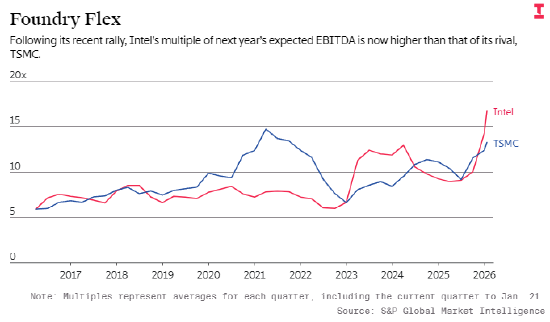 2024 至 2025 年的大部分时间里,以预期税息折旧及摊销前利润(EBITDA)的市盈率衡量,英特尔的股价一直低于全球芯片制造龙头企业台积电。但随着股价持续走高,英特尔当前的预期税息折旧及摊销前利润市盈率已升至 20 倍,创下 2021 年以来的最高水平,远超台积电目前 12.5 倍的市盈率。以明年预估销售额计算的市盈率来看,英特尔股价也处于至少十年来的最高点。