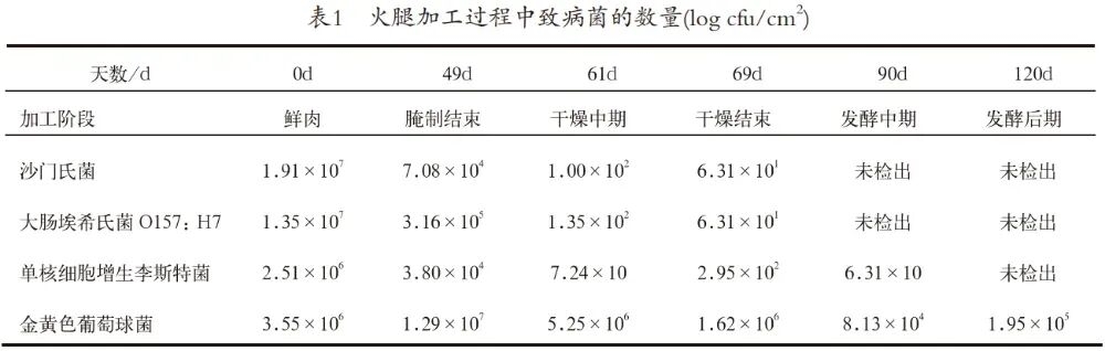 结果发现,在火腿加工过程中,接种的沙门氏菌、大肠杆菌 O157∶H7 和李斯特菌数量均持续下降,至第 90 天,前两者已无法检出;至第 120 天,李斯特菌也全部消失。