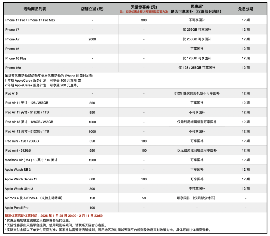 中新经纬注意到,本次促销活动涉及的产品有iPad Air、Apple Watch、AirPods 4等,优惠幅度在100元到1200元不等,部分产品还能叠加国补与天猫惊喜券。最新发售的iPhone 17 Pro、iPhone 17 Pro Max可以领取300元天猫惊喜券;Mac Book Air(M4)13英寸和15英寸店铺立减1200元。