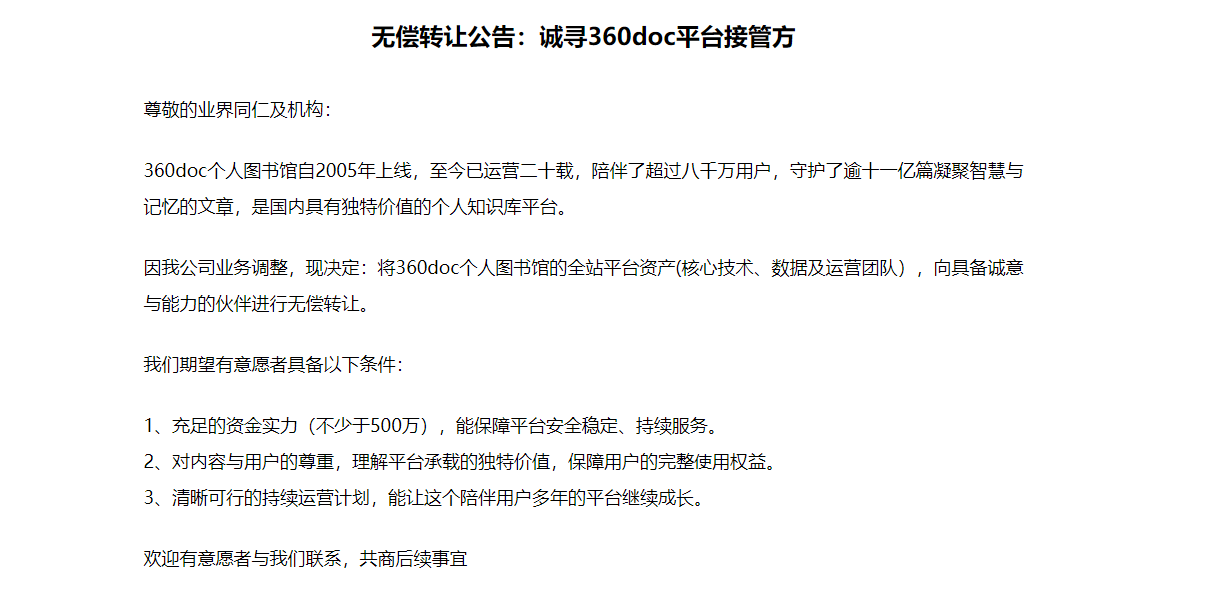 因公司业务调整,现决定将360doc个人图书馆的全站平台资产(核心技术、数据及运营团队),向具备诚意与能力的伙伴进行无偿转让。