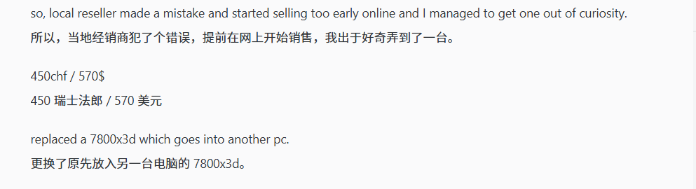 近日,一名Reddit用户爆料称,由于瑞士某零售商的操作失误,他已提前一周拿到了AMD尚未正式发售的锐龙7 9850X3D处理器。dobum表示,这款处理器标价为450瑞士法郎/570美元(约合3969元人民币),他提到,购买这款处理器是因为零售商“犯了一个错误,提前在线上销售了”。
